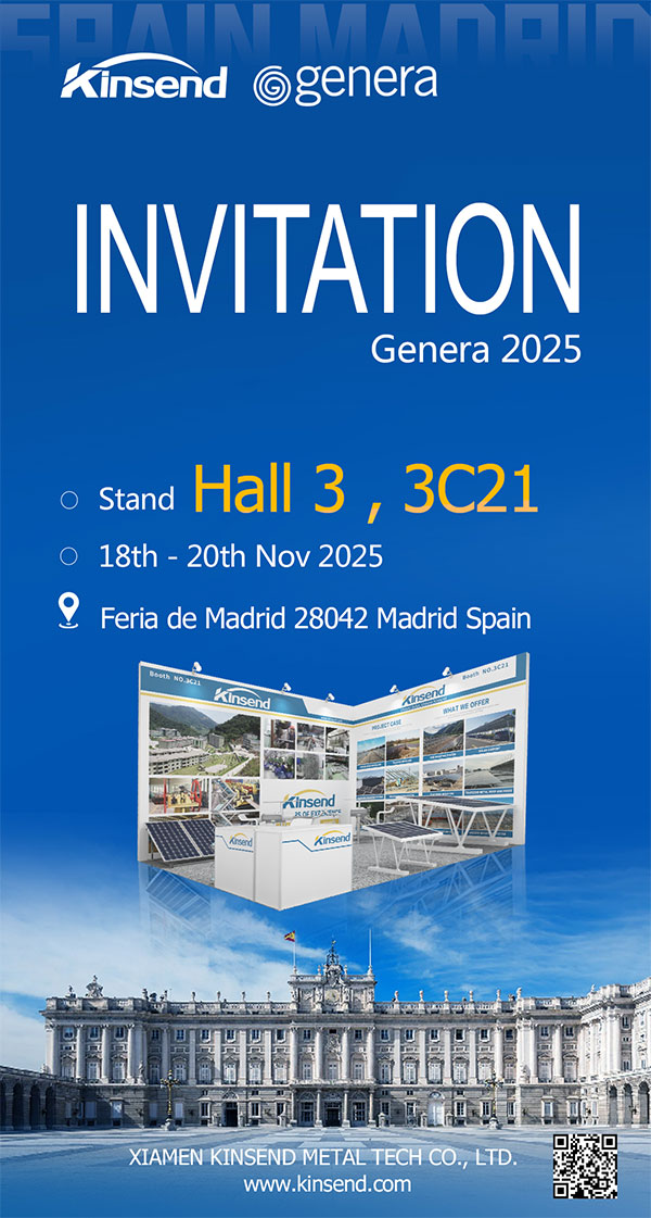 Kinsend Main Showcase Products Categories during exhibition: A variety of design solutions are available, including photovoltaic ground brackets, waterproof carports, ground ZAM steel structures, various hooks ( fixed or adjustable)for tile roofs, Tripod solar structure and a variety of installation accessories for commercial and household rooftop mounting systems... etc...